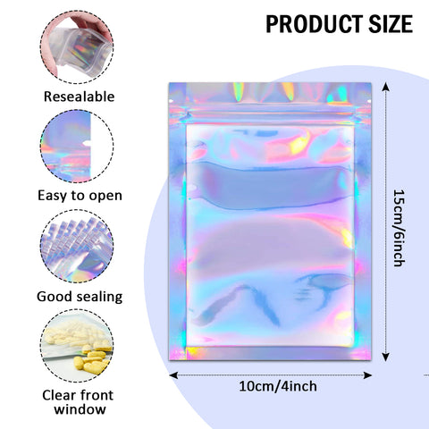 ✔【PRACTICAL AND SIMPLE DESIGN】-Our aluminum foil bags are made of quality metallic film with holographic rainbow color, shining and durable; Holographic silver back with transparent front for displaying the items and offering easy identification.