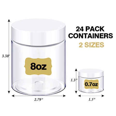 ✔【PACKAGE INCLUDES】-one set of 0.7oz x 12pcs & 8oz x 12pcs, total 24 pcs cosmetic containers with black lids, which is convenience for different uses. You will also get 30 x decorative labels for distinction and 6 x spatulas for dispensing or mixing.